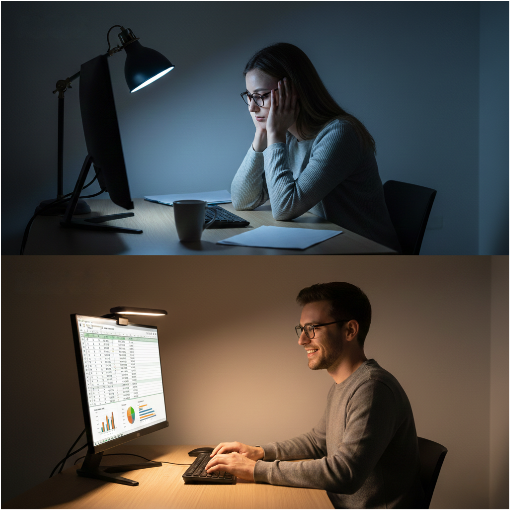 Una iluminación deficiente puede reducir tu rendimiento hasta en un 20% debido a la pérdida de enfoque. La barra MOBOA optimiza tu espacio dirigiendo la luz hacia tu área de trabajo, eliminando distracciones visuales.